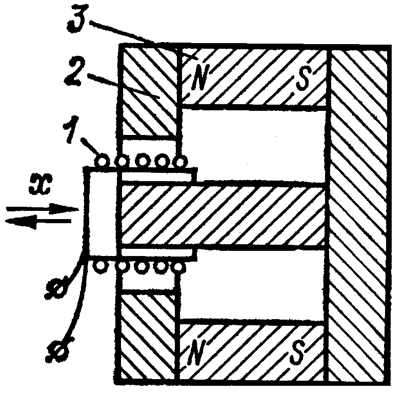 На рис. показано устройство индукционного преобразователя для измерения скорости линейного перемещения, а также амплитуды перемещения и ускорения. Преобразователь представляет собой цилиндрическую катушку 1, перемещающуюся в кольцевом зазоре магнитопровода 2. Цилиндрический постоянный магнит 3 создает в кольцевом зазоре постоянное радиальное магнитное поле. Катушка при перемещении пересекает силовые линии магнитного поля, и в ней возникает э.д.с., пропорциональная скорости перемещения. Погрешности индукционных преобразователей определяются главным образом изменением магнитного поля с течением времени и при изменении температуры.