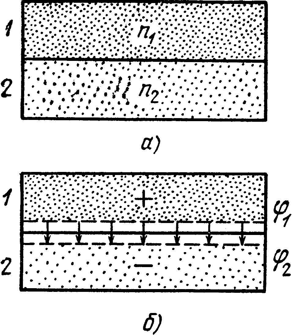 б) при их соприкосновении вследствие преимущественной диффузии электронов из 1 в 2 между металлами возникает контактная разность потенциалов.