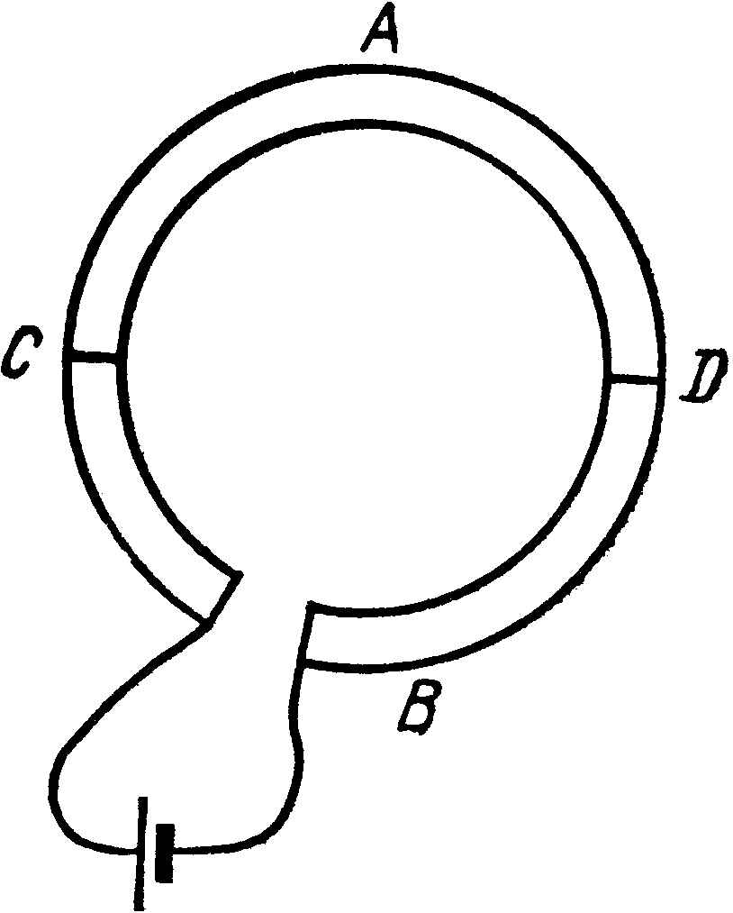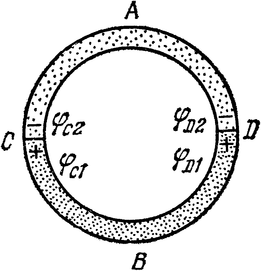 Действительно, если подогреть контакт Д, то в нем произойдет переход электронов из металла B в металл A, а контактная разность потенциалов в соединении D возрастет. Так как в металле A на конце D электронов стало больше, то они устремятся к концу С. Увеличение концентрации электронов на конце C вызовет их переход из металла A в металл B через контакт C. Отсюда они по металлу B перейдут к контакту D. Таким образом, если температура контакта D будет все время больше, чем контакта С, то по замкнутой цепи будет происходить направленное движение электронов против часовой стрелки. Следовательно, в такой цепи действует э.д.с.