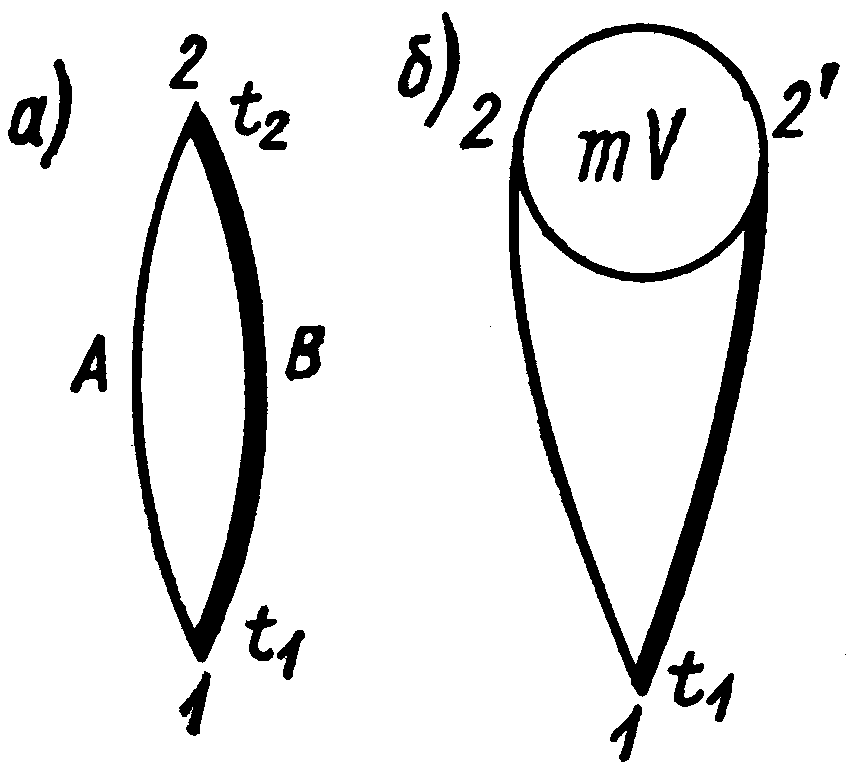 При разности температур точек 1 и 2 соединения двух разнородных проводников А и В, образующих термопару, в цепи термопары возникает термо -э.д.с. При неизменной температуре одной точки соединения (t2 = соnst)