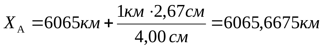 Для определения координаты Х: при помощи циркуля-измерителя и соответствующего поперечного масштаба измеряют расстояние между точкой А и координатной линией, ограничивающей точку с юга (Xю) Полученное расстояние прибавляют к заначению Xю.
