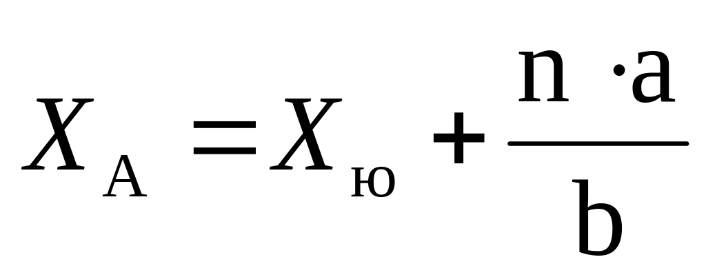 n – разность между координатными линиями, ограничивающими точку: n = Xc-Xю (на учебной карте У-34-37-В-в (СНОВ) n = 1 км) Xю – координатная линия, ограничивающая точку с юга Xc –координатная линия, ограничивающая точку с севера а2- расстояние на карте между точкой А и Хю b - расстояние на карте между Хс и Хю