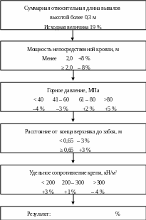 Количественная оценка состояния кровли: средняя удельная площадь вывалов перед крепью; суммарная протяженность вывалов высотой более 0,3 м; число уступов высотой более 0,1 м на 100 м2 площади кровли. Управление кровлей не эффективно, если площадь вывалов или их протяженность более 30 %, или число уступов больше 5.