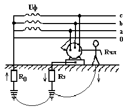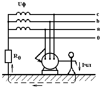 Рис.1.2. Однофазное включение человека в трехфазную сеть с глухозаземленной нейтралью: 0 – нулевой провод; R0 – сопротивление заземления нейтрали
