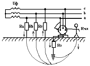 Рис.1.3. Схема защитного заземления в сети напряжением до 1000В с изолированной нейтралью: Rз – сопротивление заземляющего устройства, Rчл – сопротивление тела человека