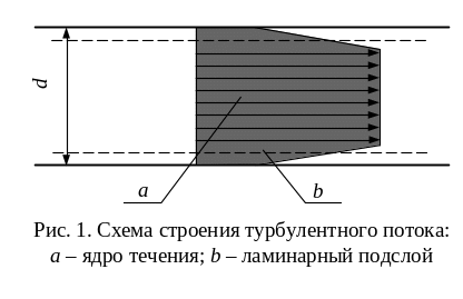 По наиболее распространенной гипотезе Прандтля турбулентный поток состоит из ядра течения и ламинарного слоя, между которыми находится переходная область (рис.1).