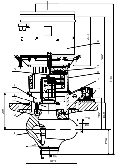 1 – «улитка» насоса, 2 – биологическая защита, 3 – перекрывающее биологическое кольцо, 4 – нижняя проставка, 5 – торсионная муфта, 6 – электродвигатель, 7 – маховик, 8 – верхняя проставка, 9 – кронштейн, 10 – шаровая опора, 11 – выемная часть.