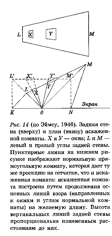 Удивительно, что люди, страдающие анизейконией, воспринимают тем не менее окружающий мир нормально. Дома и стены видятся прямыми, несмотря на то, что они должны искажаться в соответствии с законами оптики. Так, человек, рассматривающий комнату через линзу, изображенную на рис. 13, должен видеть правый дальний угол более удаленным, а левый — более близким, несмотря на то, что реальные расстояния до них одинаковы (как это показано на рис. 14). Однако это не всегда так! Если стены комнаты ош-