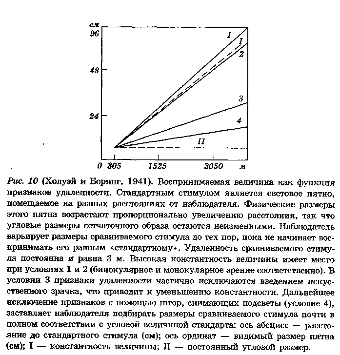 находятся в соответствии с законом константности. Но как только был введен искусственный зрачок, устранивший дополнительные признаки удаленности, оценки наблюдателя оказались в промежуточном положении между оценками, соответствующими закону константности и закону угла зрения (линия 3). При этом еще сохранились остатки признаков глубины в виде слабых подсветов от дверей, расположенных вдоль коридора. Когда же и они были исключены с помощью черных штор, результаты еще больше приблизились к закону угла зрения (прямая 4). Позднее Личтон и Лурье (1950) еще более ограничили признаки удаленности, используя экраны, которые не позволяли наблюдателю видеть ничего, кроме светового пятна. В этих условиях не оставалось даже и намека на константность величины. Эти два эксперимента ясно показывают, что наблюдатель может правильно оценивать размеры неизвестного ему предмета лишь в той мере, в какой у него есть надежные источники информации об его удаленности.
