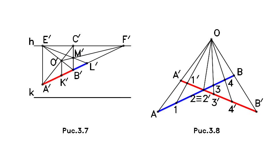 2. Деление отрезка на пропорциональные части (рис.3.8). Отрезок A/B/ разделен на пропорциональные части в перспективе в том же отношении, что и отрезок AB, если существуют три пары точек A и A/, 2 и 2/, B и B/, через которые можно провести прямые, пересекающиеся в одной точке O.