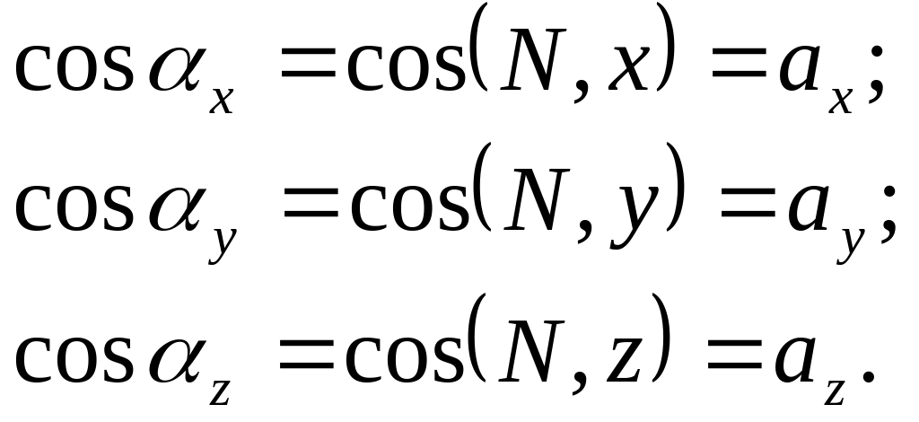 Докажем, что если заданы напряжения в трех взаимно перпендикулярных площадках, проходящих через данную точку, то ее напряженное состояние вполне определено. Проведем плоскость наклонно к осям координат (рис. 2). В результате получим фигуру тетраэдра Оаbс, сливающегося с точкой О при бесконечном убывании величины его граней. Пусть N – нормаль к наклонной грани тетраэдра. Положение ее определится направляющими косинусами