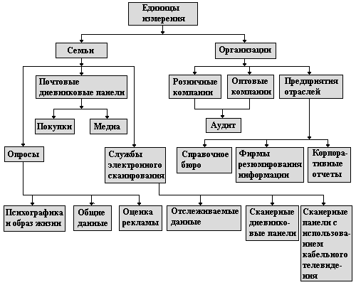 На рисунке представлена классификация синдицированных источников в соответствии с критерием единицы меры (семьи и потребители или организации). Данные о семьях или потребителях получают с помощью опросов, дневников участников панелей, отзывов потребителей, электронного сканирования.