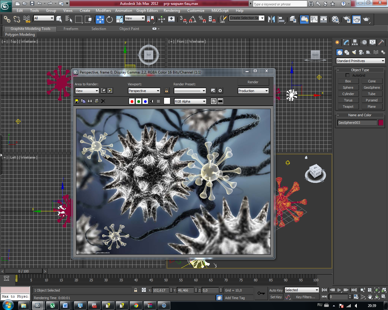 Для создания такого объекта сцены как бацилла воспользуемся стандартным примитивом GeoSphere. Для этого необходимо зайти во вкладку Create → Standart Primitives → GeoSphere. Перейдя на вкладку Modify, настроить такие параметры геосферы, как радиус и количество сегментов (см. рис.1).