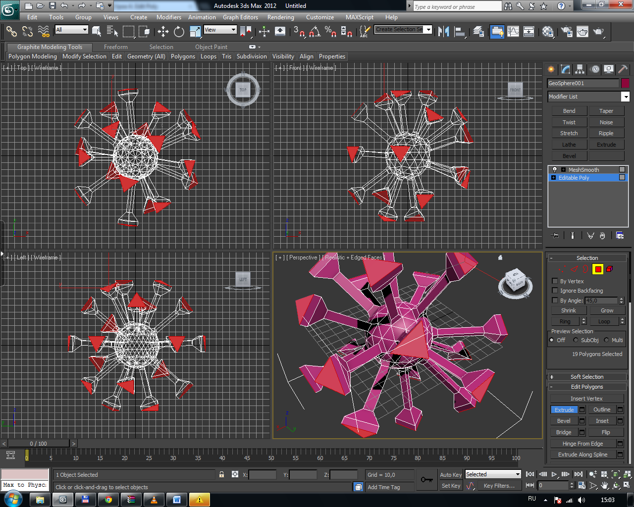 Применим команду Extrude для выдавливания выделенных полигонов, а затем такую команду трансформации как масштабирование (Scale). Проделаем данные операции несколько раз.