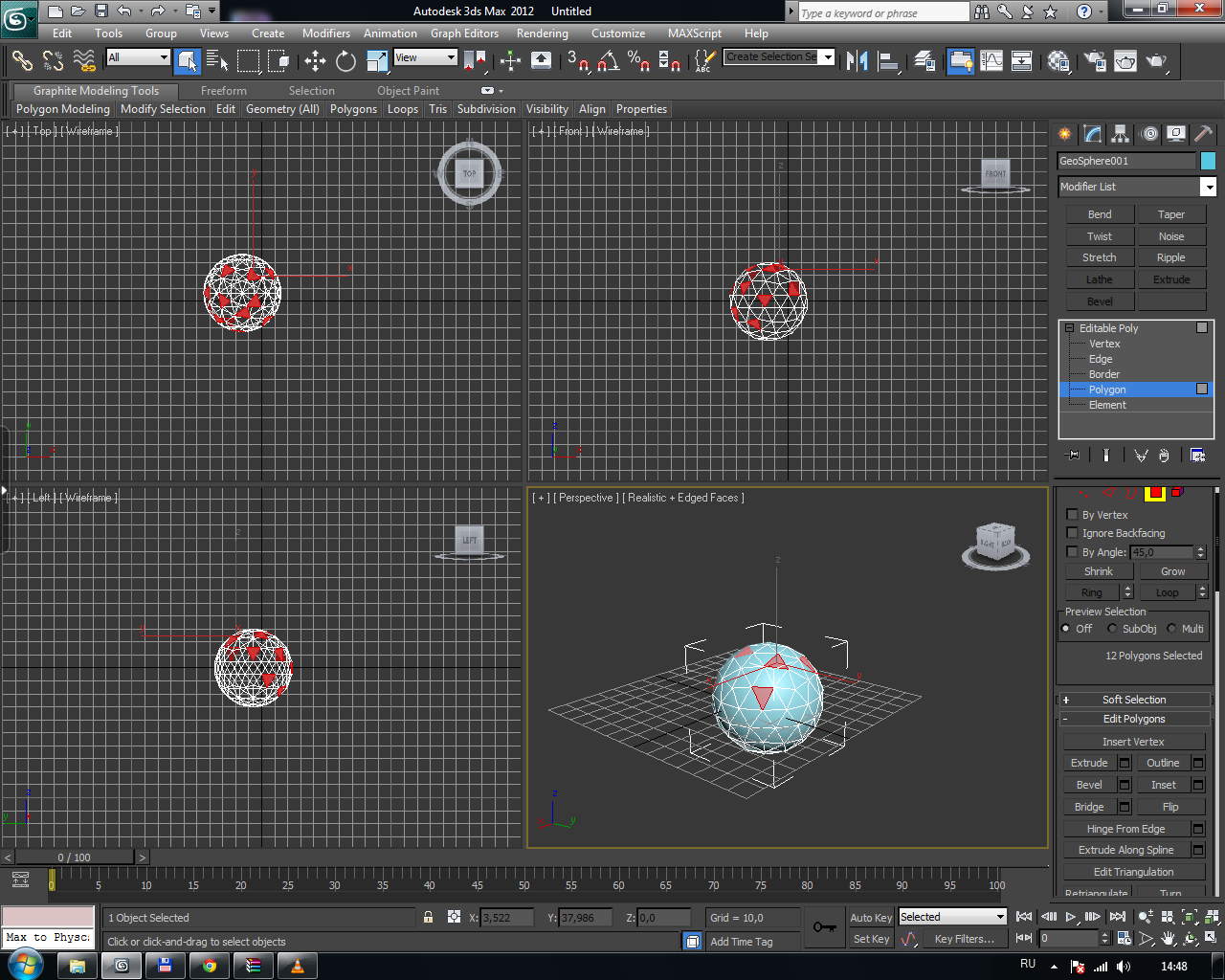 Перейдем на подобъектный уровень Polygon, выделим произвольным образом сегменты, зажав клавишу Ctrl, вращая при этом наш объект, используя такое сочетание клавиш, как Alt+колесико мыши