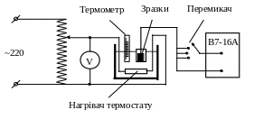 Прилади і матеріали: Термостат з підігрівом, термометр, вольтметр В7-16А, зразки матеріалів.