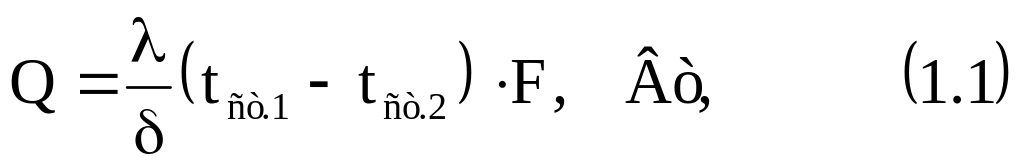 де λ – коефіцієнт теплопровідності матеріалу стінки, Вт/(м град); δ – товщина стінки, м; F – бокова поверхня стінки, яку пронизує тепловий потік, м2; tст.1, і tст.2 – температура гарячої і холодної поверхонь стінки, оС.