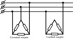 Более удобно для регулировки тепловой мощности электронагревателей при подключении к 3х фазной сети использовать какой-то один способ подключения. Так, при подключении 3 секций электронагревателей к 3х фазной сети с напряжением 220 В обычно используют способ "треугольника" (рис.2.7), а с напряжением 380 В - "звездой" (рис.2.8