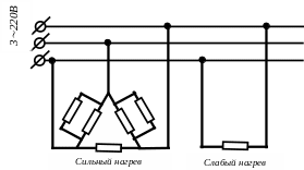 При наличии 6 электронагревателей подключение к 3х фазной сети переменного тока с напряжением 220 В можно производить по схеме, представленной на рис.2.9. Соотношение между тепловой мощностью при сильном и слабом нагреве во всех указанных способах составит 6 1. Возможны и другие варианты регулировки мощности электронагревателей