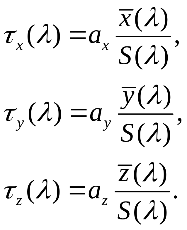Для воспроизведения приемников с необходимой спектральной чувствительностью в объективном колориметре, как правило, используется один фотоэлемент с тремя исправляющими светофильтрами. Функции спектральных коэффициентов пропускания x(), y(), z() этих светофильтров должны удовлетворять следующим условиям: