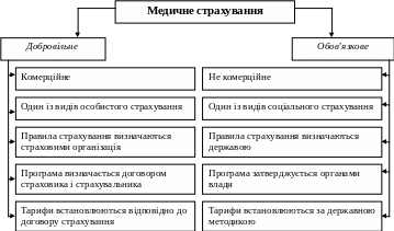 Медичне страхування передбачає страхування на випадок втрати здоров'я з будь-якої причини. Воно має певні переваги перед приватними і державними системами, а також відомчою медициною, забезпечуючи більшу доступність, ясність і повноту щодо задоволення різноманітних потреб населення в наданні медичних послуг. Об'єктом медичного страхування є майнові інтереси, пов'язані з життям і здоров'ям громадян, а його метою - забезпечення застрахованим особам при виникненні страхового випадку права на отримання медичної допомоги за рахунок нагромаджених коштів та фінансування профілактичних заходів. Медичне страхування поділяється за формами на обов’язкове і добровільне (рис. 6.1).