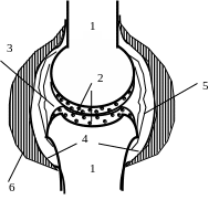 2 – суставные хрящи; 3 – суставная полость с суставной жидкостью;