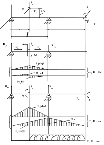 На рис. 4б, г силы в зацеплении приведены к оси вала и изображены раздельно в вертикальной и горизонтальной плоскостях. При этом возникают пары сил, равные T = 0,5 Ft d1 и момент М = 0,5 Fa d1.