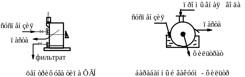 При отражении на чертеже этой и другой химической аппаратуры допускаются и иные типы условных изображений. Следует отметить то, что каждая установка должна иметь весь необходимый набор запорной арматуры – краны, вентили, сообщение с атмосферой (воздушки), смотровые фонари и т. п.