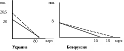4. Допустим, что установилась пропорция обмена 1 т пш. = 3 т карт. Допустим также, что Белоруссия может продать Украине только 6 млн. т пшеницы, не сокращая собственного потребления. Каким количеством картофеля и пшеницы будет измеряться выгода каждой страны?