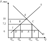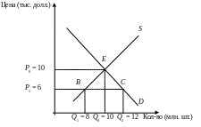 Мировая равновесная цена на автомобили сопоставимого класса значительно ниже и соответствует 6 тыс. долл. Если в страну будут свободно импортировать данные автомобили по цене 6 тыс. долл., то цена упадет на 4 тыс. долл. В этом случае объем продаж возрастет до 12 млн. автомобилей, т.е. вырастет на 2 млн. единиц. Но при этом объем продаж отечественных автомобилей сократится на 2 млн. автомобилей и составит 8 млн. Разницу между общим объемом продаж отечественных автомобилей составит импорт 12 – 8 = 4 млн. автомобилей.