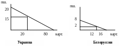 Максимальные производственные возможности Украины составляет 20 млн. т пшеницы или 80 млн. т картофеля. Аналогичные возможности Белоруссии составляют 8 млн. т пшеницы или 16 млн. т картофеля.