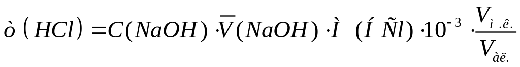 Ниже таблицы результатов приводятся расчеты. В данном случае требуется рассчитать не только массу соляной кислоты (г), содержащуюся в анализируемом растворе, но и титр раствора соляной кислоты (г/см3). Для расчетов применяют следующие формулы: