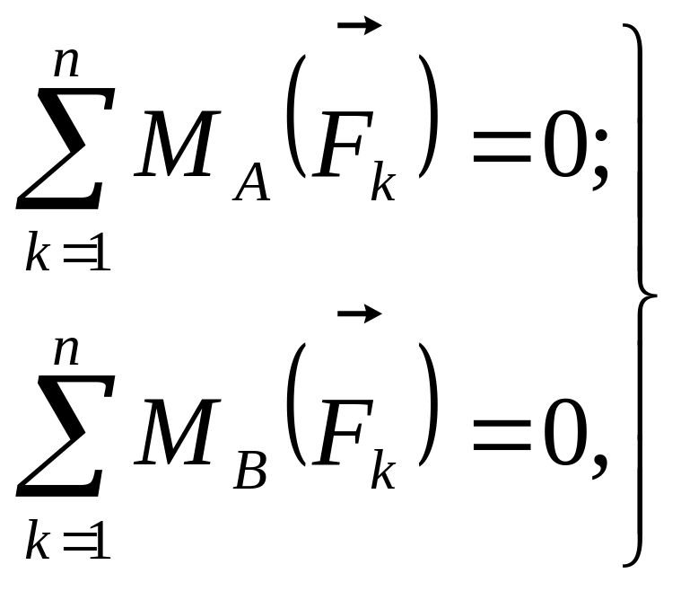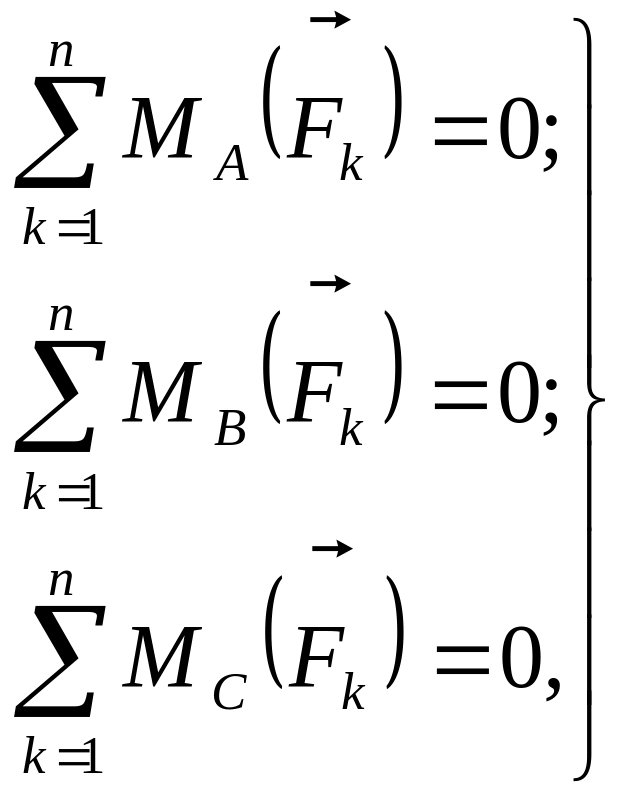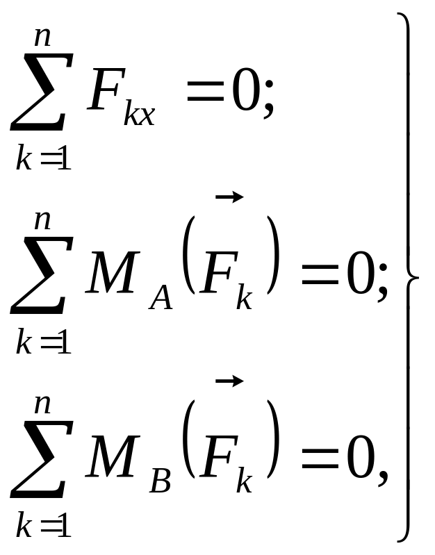 Уравнения равновесия твердого тела под действием произвольной плоской системы сил можно записать в одной из следующих форм: