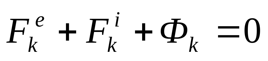 Однако для решения задач применяют не сам принцип Даламбера, а следствия из него. Для их вывода представим равнодействующую сил, приложенных к k-й точке системы, в виде двух составляющих: равнодействующей внешних сил, приложенных к точке, и равнодействующей внутренних сил, приложенных к точке, то есть