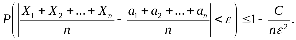 Если дисперсии n независимых случайных величин ограничены одной и той же постоянной C, т.е. M(X1) = a1, M(X2) = a2 , … , M(Xn) = an,