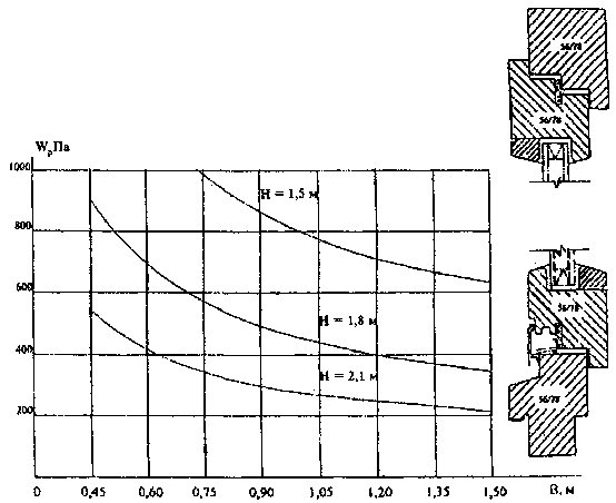 Рисунок Б.1 — Пример графического определения соотношения высоты Н и ширины В створчатых элементов с сечением брусков 56 х 78 мм в случае воздействия ветровой нагрузки Wp (для распашного и поворотно-откидного открывания, масса стеклопакета — не более 50 кг)