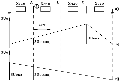 а) схема нулевой последовательности сети; б) зависимость при КЗ в зоне действия защиты; в) зависимость при КЗ «за спиной» защиты