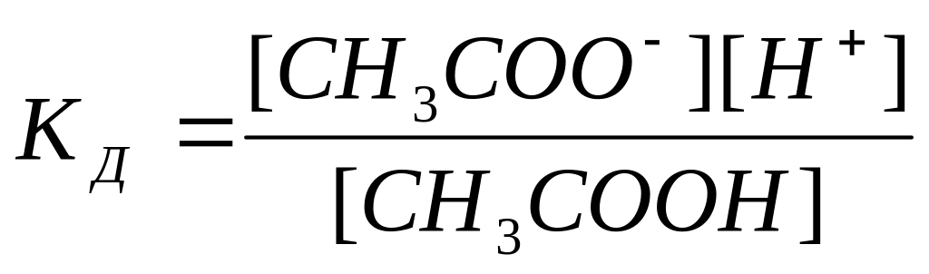 Обратимый процесс распада слабых электролитов характеризуется константой диссоциации КД. Например, для слабой уксусной кислоты процесс диссоциации которой идет в соответствии с уравнением