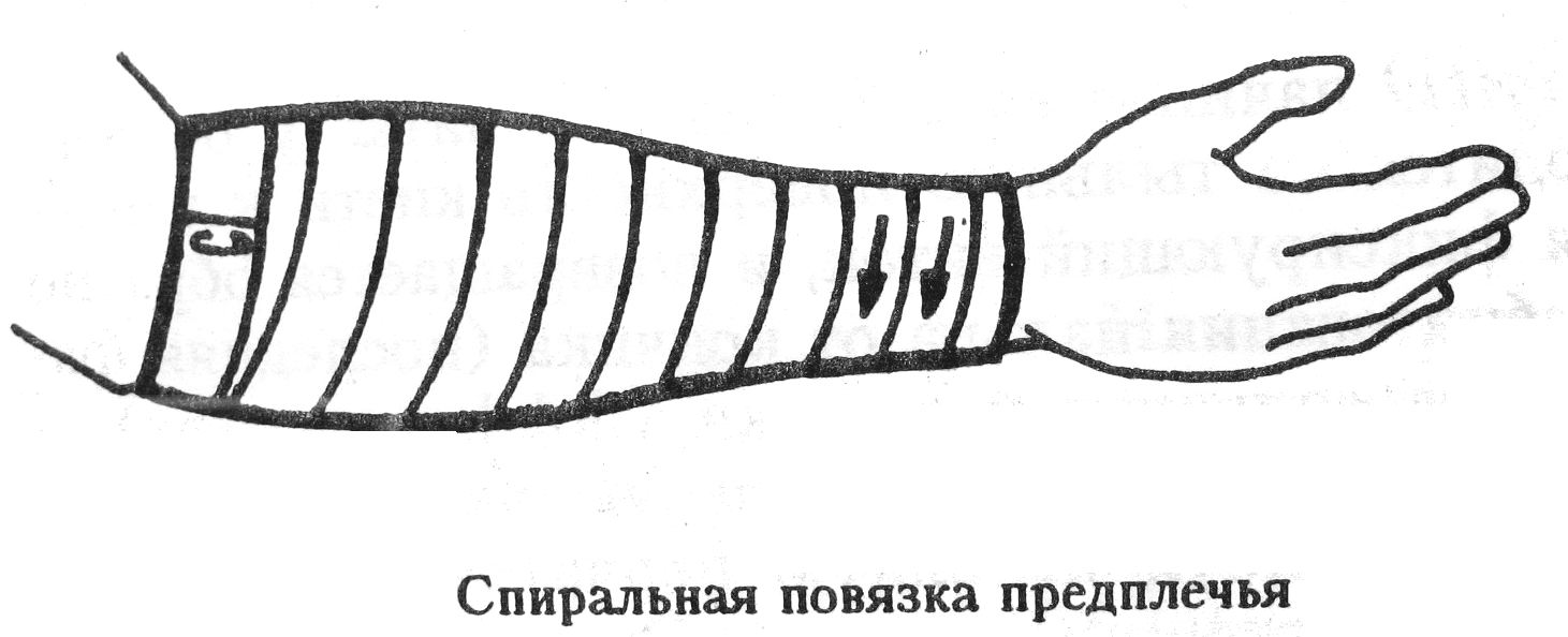 Пов’язки на верхню кінцівку. Пов’язки на пальці і кисть. Спіральна пов’язка застосовується при бинтуванні пальців. Вона починається коловими ходами в ділянці зап’ястка, потім, при бинтуванні одного пальця, бинт ведуть по тильній поверхні кисті до кінця пальця, спіральними ходами укутуючи його. Спіральну пов’язку таким способом можна накласти на всі пальці. Фіксують її в ділянці зап’ястка.