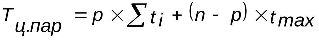 При параллельном виде движения передача предмета труда с одной операции на другую осуществляется поштучно, по мере окончания процесса обработки на каждом рабочем месте. В связи с этим в отдельные периоды все операции по обработке данной партии изделий осуществляются одновременно. Цикл изготовления партии продукции будет равен длительности всех производственных операций по обработке одного изделия, времени его пролеживания на отдельных рабочих местах, продолжительности обработки и пролеживания остальных изделий партии при выполнении одной из операций и времени прочих перерывов.