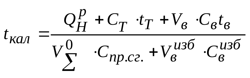 где qPH – низшая теплота сгорания топлива, кДж/кг или кДж/м3; СТ – средняя теплоемкость топлива от 0° до tT, кДж/(кг∙К) или кДж/(м3∙К); Vв – объем воздуха, поступающего для сжигания 1 кг или 1 м3 топлива, м3; tв - температура воздуха, поступающего в топку, oC; VoΣ – суммарный объем неразбавленных воздухом продуктов сгорания 1 кг или 1 м3 топлива, м3; Спр.сг – средневзвешенная теплоемкость неразбавленных воздухом продуктов сгорания от 0° до tкал, кДж/(м3∙К); Vизбв – объем избыточного воздуха, содержащегося в продуктах сгорания, м3; Сизбв – средняя теплоемкость избыточного воздуха от 00 до tкал, кДж/(м3∙К); tкал – калориметрическая температура горения, °С.