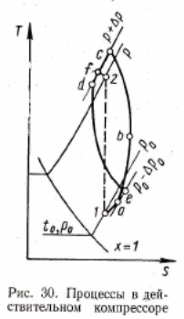 Изменение состояния рабочего вещества в цилиндре действительно-го компрессора и соответствующие потери удобно показать на sT-диаг-рамме (рис. 30). Пусть из испарителя в компрессор поступает несколько перегретый пар, состояние его определяется точкой 1 на изобаре . Теоретический процесс сжатия изображается прямой линией 1—2, которая представляет собой адиабату (S- const). В действительном про-цессе состояние холодильного агента в цилиндре перед сжатием опре-делится точкой а. Давление пара в точке а будет меньше, чем в точке 1, вследствие наличия гидравлических сопротивлений при всасывании (на величину ).