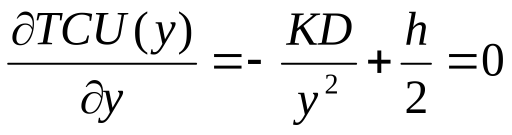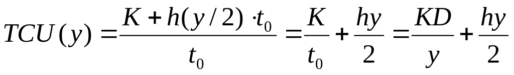 Пусть К – затраты на оформление заказа, имеющие место всякий раз при его размещении и затраты на хранение единицы заказа в единицу времени равны h. Cуммарные затраты в единицу времени TCU(y) как функцию от Yможно представить в виде: