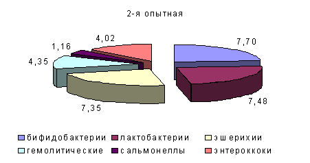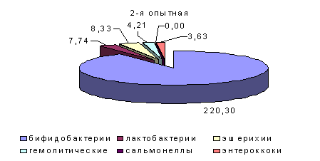 До применения пробиотика в химусе слепых отростков 30-суточных цыплят-бройлеров опытных и контрольной групп, больных колибактериозом, до лечения количество бифидобактерий, лактобактерий, эшерихий, гемолитических бактерий, сальмонелл и энтерококков было на одном уровне (табл.30, рис.4).