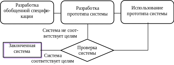 На основе обобщенных требований к системе строится ее прототип, который анализируется и оценивается пользователями и разработчиками. Изменение и уточнение требований, формирование новых требований приводит к необходимости переработки прототипа и его повторной оценки. Результатом прототипирования являются спецификация системных требований и, значительно реже, повторно используемые компоненты.