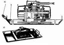 Площадочный вибратор (рис. 7) передает колебания уложенной массе бетона через корытообразную прямоугольную в плане металлическую площадку 2, к которой болтами жестко прикреплен мотор-вибратор. При работе площадочный вибратор уплотняет от дельные участки заранее распределенного слоя бетонной смеси Вибратор перемещают в процессе работы вручную с помощью тяг / с рукоятками или с помощью легких грузоподъемных средств. Электродвигатель вибратора мощностью 0,6 кВт подключают к питающему кабелю через штепсельное соединение. Вибратор развивает вынуждающую силу 4,5...9,0 кН. Размеры опорной площадки вибратора (ширина х длина) составляют 600x1100 мм, масса 60 кг, амплитуда колебаний 0,2...0,3 мм.