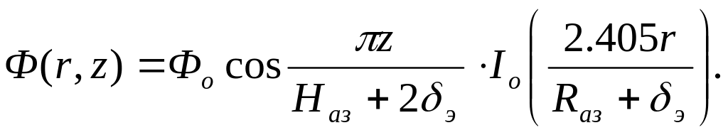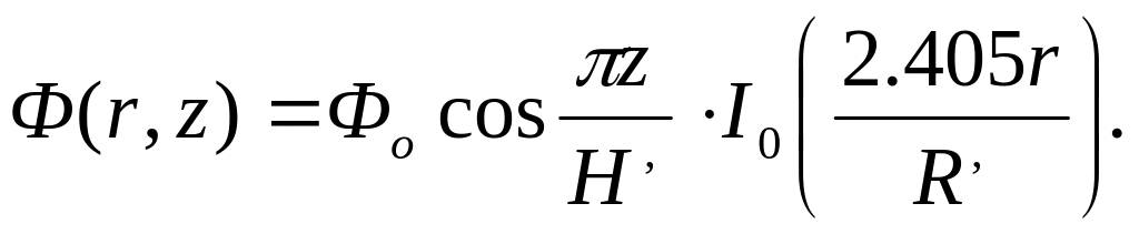 Таким образом, и в гомогенном цилиндрическом реакторе с отражателем распределение плотности потока тепловых нейтронов по высоте подчинено закону косинуса, а по радиусу – закону функции Бесселя первого рода нулевого порядка (для действительного аргумента).