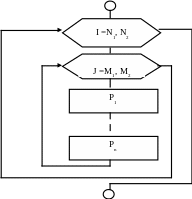 При первом вхождении в цикл параметр внешнего цикла i принимает значение, равное N1 , и управление передаётся во внутренний цикл, в котором параметр цикла j принимает значение, равное M1 , и выполняется оператор (операторы), которые записаны во внутреннем цикле. Затем параметр внутреннего цикла j увеличивается на 1, и вновь выполняется тело цикла. Операторы P1, PN будут выполняться до тех пор, пока параметр цикла j не станет больше величины М2. Затем параметр внешнего цикла i увеличивается на 1, и вновь начинает свою работу внутренний цикл, в котором параметр цикла j будет изменяться от М1 до М2, и при каждом прохождении цикла будут выполняться операторы P1 и PN. Внешний цикл закончит свою работу, когда параметр цикла i станет больше величины N2.