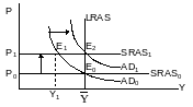 Надо учесть, что в условиях кризиса ресурсы используются не полностью. Избыток неиспользуемых ресурсов, в конце концов, приведет к падению цен на них. Высокая безработица, в частности, окажет понижательное воздействие на заработную плату занятых. Снижение цен на ресурсы постепенно приведет и к уменьшению цен на готовую продукцию. Таким образом, в длительной перспективе цены начнут снижаться, что отражается в сдвиге краткосрочной кривой совокупного предложения вниз из положения SRAS0 в положение SRAS1. И в конце концов (очень не скоро) экономика вернется к потенциальному ВВП при более низких ценах (P1), т.е. долгосрочное равновесие будет достигнуто в т. Е2.