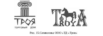 На здании фирмы установлены флаги с названием, имеется охраняемая стоянка для автомобилей. Рядом со зданием компании расположена столовая, которая принадлежит другой фирме в рамках группы компаний «Троя». Название организации находит свое отражение в оформлении – в документах, на печатях, в рекламных объявлениях используются буквы схожие по написанию с античными. В качестве символа фирмы выбрана античная колонна, а также используется изображение лошади (рис. 15).
